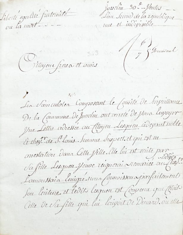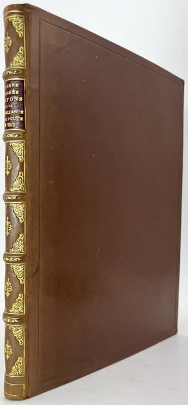 Recueil de 108 lettres manuscrites datées du 30 ventôse an II (20 mars 1794) à mai 1813, relatives à la surveillance des émigrés bretons (demandes de délivrance de passeports et de surveillance...), généralement écrites sur papier à entête officiel, la plupart sont adressées par le Conseiller d'État chargé du premier arrondissement de la Police générale de l'Empire à Paris au Préfet d'Ille et Vilaine.Liste des familles concernées reliée en fin de volume : La Motte-Vauvert, Bréhier, Kéroignant, Saint-Gilles, Onffroy, Gardin de La Pillardière, Cheffontaines, Thomas de la Rignerais, Visdelon de Bédé, Langle, Surcouf, Hascouet de Saint-Georges, etc.D'après Karine Rance - (« L’historiographie de l’émigration ». Les noblesses françaises dans l’Europe de la Révolution) - sur l’ensemble des émigrés en France (environ 150.000), la majorité appartient au Tiers état (51 %), devant le clergé (25 %) et la noblesse (17 %), avec de fortes variations régionales pouvant faire de la noblesse un groupe très minoritaire ou, au contraire, majoritaire selon les départements (en Ille-et-Vilaine 25 %). Deux grandes vagues d’émigration se distinguent : la première, jusqu’en 1792, est limitée et concerne surtout nobles et ecclésiastiques ; elle apparaît comme un choix. La seconde, à partir de 1793, est beaucoup plus massive, essentiellement populaire et étroitement liée aux violences révolutionnaires.Provenance : Fournier de Bellevüe (ex-libris armorié).