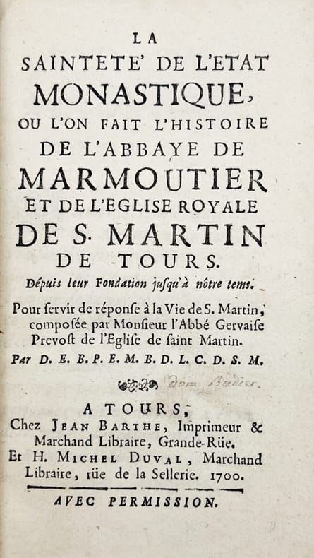 Unique édition imprimée par Jean Barthe, imprimeur du chapitre de Saint-Martin [de Tours], natif d'Agen, fils du libraire Pierre Barthe. Après cinq ans d'apprentissage à Agen chez son oncle Bernard Bru, il travailla 18 ans comme compagnon dans diverses villes du royaume : Bordeaux, Angoulême, Nantes, Rennes, Angers, Paris, Dijon, Valence, Montpellier et Lyon. Reçu imprimeur-libraire à Tours le 5 février 1695, en succession de Jacques I Floceau (1621?-1699), dont il racheta le matériel. Lors de l'enquête royale de 1701, il possédait alors deux presses et n'employait ni compagnon ni apprenti. Il travailla en association avec le libraire de Tours Hugues-Michel Duval en 1699 et 1700.Jean-Étienne Badier (1650-1719) était prêtre et moine bénédictin de la congrégation de Saint-Maur. Professeur de théologie et de philosophie à l'abbaye de Saint-Denis, puis Prieur de Saint-Julien de Tours, puis de Corbie. « Seul ouvrage que nous ayons du P. Badier, qui n'avoit pas un merveilleux talent pour écrire en notre lanque : ses raisons ont plus de solidité, que son style n'a d'agrément » (Le Cerf de la Viéville).Emmanuel Barth était relieur au 5 rue Ragueneau à Tours. Il exerça de la fin du XIXe siècle jusque vers 1920. L'activité fut poursuivie par son fils durant le deuxième quart du XXe siècle. Ex-libris manuscrits du Comte L. Clément de Ris (1869) et du Comte X. de Bellevüe (1898). Bel exemplaire. Quelques petites taches dans le texte. Jean-Philippe Le Cerf de La Viéville, Bibliotèque historique et critique des auteurs de la Congrégation de St. Maur, p. 6.