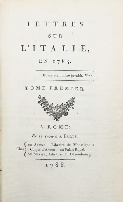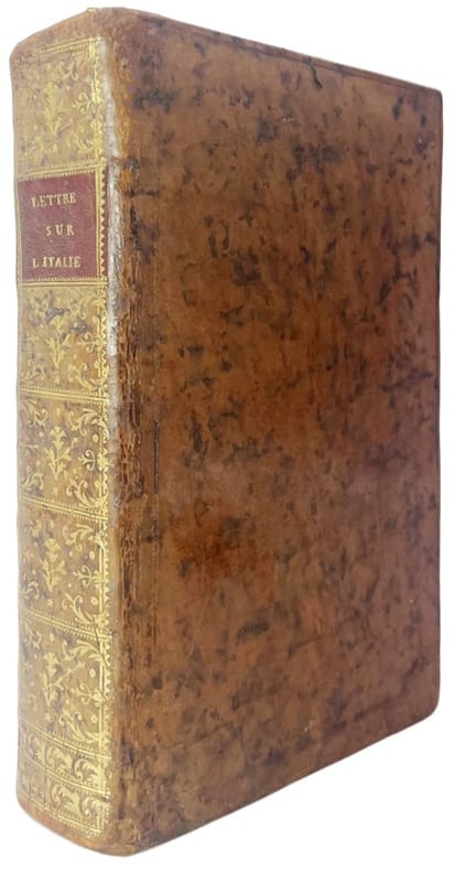 Édition peu commune probablement la deuxième, d'une oeuvre qui en connût de nombreuses et fut traduite en anglais, en allemand, en suédois et en néerlandais. « En 1784, le garde des sceaux donna à Dupaty mission d'étudier en Italie la réforme de la législation criminelle. Il partit par Avignon, Toulon, Nice, visita Gênes, Lucques, Florence, Rome, Naples, prenant, au jour le jour, des notes qu'il rédigeait aux étapes. Sans négliger les arts, les lettres, les notes pittoresques sur les villes italiennes, il s'attachait surtout à critiquer les gouvernements monarchiques et à attribuer, avec une insigne mauvaise foi, les maux résultant de la paresse et de l'incurie des peuples au despotisme des princes, à la carence des lois, à l'insuffisance des constitutions. Écrites sur ce ton ampoulé et déclamatoire que mettra à la mode la littérature révolutionnaire, elles furent publiées encore en 1824, avec une bonne introduction de Louis Dubois ». Dict. Bio. français, t. XIII. C'est à la suite de cette édition que le livre fut mis à l'Index ou il figurait encore dans la dernière édition (1948)."Le lettere iniziano da Avignon, in aprile, con una magnifica descrizione della « Fontaine de Vaucluse ». Nella prima parte dell'opera sono comprese: Avignon, Toulon, Gênes (16 lettere), Lucques, Pise, Florence (19 lettere), Rome (21 lettere che includono Tivoli e Frascati). A Roma e dintorni sono dedicate altre 27 lettere della seconda parte. Il viaggio termina, senza date, con 22 lettere: Napoli, Portici, Salerno, Paestum e Pompei.La lettera CXIII da Napoli esordisce con l'esclamazione: « Quel dommage que ce pays soit si mal administré! » (p. 209). Seguono pagine liricheggianti e la traduzione da Plinio della prima eruzione del Vesuvio. La lettera CXV ed ul-tima è dedicata alla visita delle isole napoletane. Termina un poco bruscamente: « Quittons-les, ces dangereux rivages, et rembarquons-nous pour Naples. - Après demain nous retournerons à Rome »." Fiammetta Olschki 219 à 222; Raccolta Fossati Bellani, 409 à 417; Bibliographie du voyage français en Italie, p. 98 ou encore Brunet, 20175 aucunes de ces bibliographies ne mentionnent la nôtre. Brunissure dans la marge intérieure des premiers feuillets du second tome.