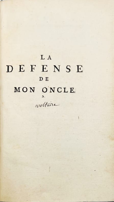 Cet exemplaire comporte deux titres : - La philosophie de l'histoire par feu l'Abbé Bazin [Voltaire] à Amsterdam chez Changuion 1765 336 pages in-8. 1765. broché. 336 pages. VIII-336 pages. - La défense de mon oncle contre ses infames persécuteurs par A.T de V*** [Voltaire] à Genève en 1767 VIII-100 pages. In-8 broché (198x124 mm). Bandeaux lettrines et culs-de-lampe. Couverture d'attente non imprimée en état correct avec une coupure de 6 cm à une charnière. Quelques brunissures et taches d'eau anciennes (claires) laissant une impression d'ensemble très satisfaisante. Rarissime. Poids : 340 gr