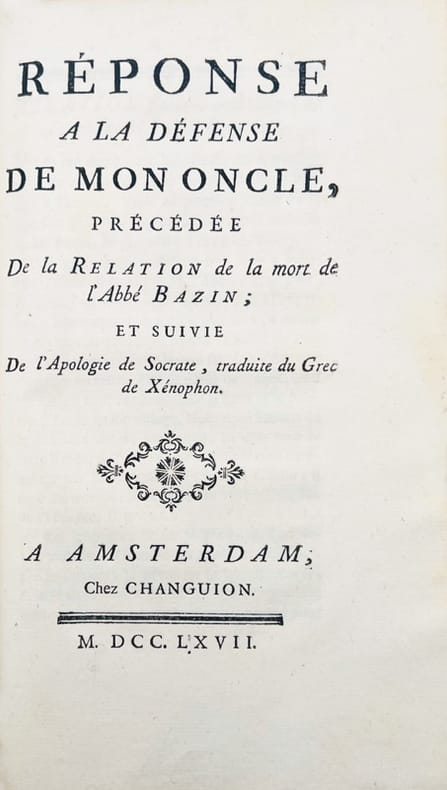 Sans lieu, , 1767. In-8 de 108 pp.[LARCHER (Pierre-Henri)]. Réponse a la Défense de mon oncle, précédée de la Relation de la mort de l'abbé Bazin ; et suivie de l'Apologie de Socrate, traduite du grec de Xénophon. A Amsterdam, chez Changuion, 1767. In-8 de 64 pp.Ensemble 1 vol. in-8, veau marbré, dos plat avec deux pièces de titre, triple filet doré sur les plats, tranches marbrées (reliure de l'époque).