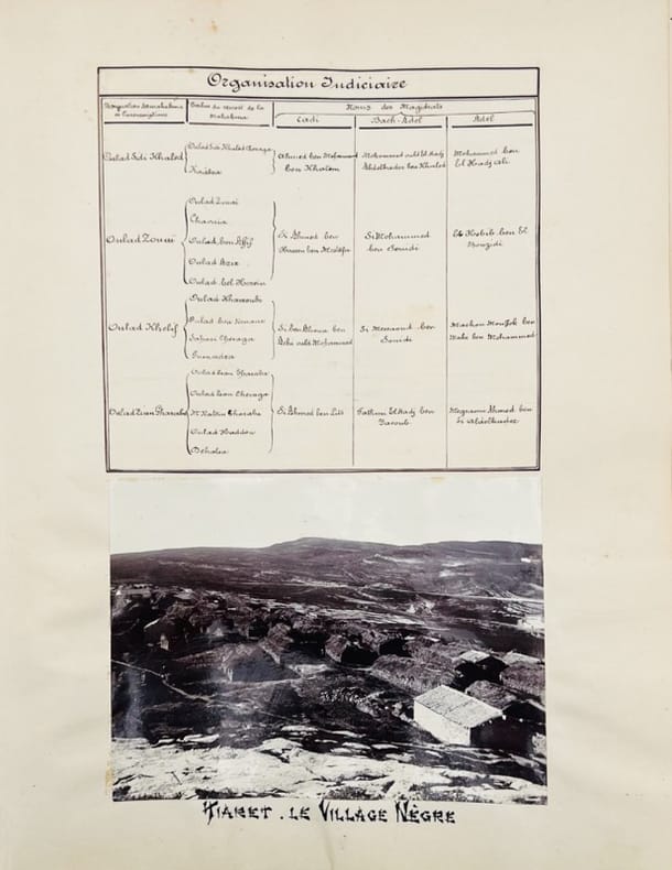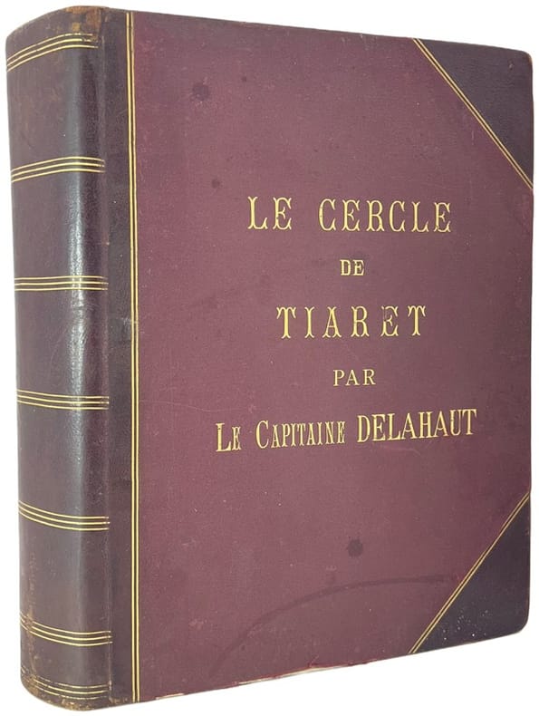 Description inédite de la ville de Tiaret dans le sud oranais à l'époque coloniale, de 1843 à 1902, illustrée de 119 précieuses photographies. « Pendant plus de soixante ans, le Cercle de Tiaret a été administré par l'autorité militaire. Au moment où il vient d'être rattaché au territoire civil, nous avons cru devoir écrire ces quelques pages qui rappellent son glorieux passé. Biskra le 1er janvier 1909 » (préface du capitaine Delahaut).Le 24 mai 1841, Tiaret est prise et détruite par le corps expéditionnaire organisé par le gouverneur général Bugeaud et le général de Lamoricière, après avoir vaincu l'émir Abdelkader. « C'est de 1843, treizième année du règne de Louis Philippe que date la fondation du poste et par suite de la ville de Tiaret, chef-lieu du cercle du même nom. » Le cercle était la plus petite unité de l'administration dans les colonies africaines de la France, composé de plusieurs cantons, qui eux-mêmes se composaient de plusieurs villages. Le commandant de cercle était sous l'autorité du commandant de zone, qui lui-même relevait du gouvernement de la colonie.Sommaire : I. Historique des faits, 1843-1902 (159 pp.) II. Limites (7 pp.) III. Origines et historique des populations, Confédérations des Harrar, des Sahari, Tribu des Guenadza (28 pp.) IV. Familles influentes (24 pp.) V. Topographie (41 pp.) VI. Agriculture, commerce et industrie (18 pp.) VII. Confréries religieuses (17 pp.) VIII. Ruines et monuments romains (23 pp.). Appendices : Étymologie et identité de Tiaret ; Prise de la smala d'Abd-el-Kader (P. Bastard, Le Général Mellinet en Afrique) ; « Autre version de la Prise de la smala d'Abd-el-Kader » (48 pages)Exemplaire unique de ce manuscrit enluminé orné d'un titre décoré en noir et de nombreux dessins et illustrations au lavis (préface, sommaire, têtes de chapitre, lettrines, en-têtes, culs-de-lampe), 2 cartes dessinées à pleine page, 13 cartes dessinées dans le texte, 2 cartes gravées contrecollées à pleine page.En outre, 119 photographies sur papier albuminé, montées dans le texte, illustrent chacune des parties, des vues de la « ville nouvelle » et de ses environs, la population (portraits de groupe et individuels) etc.Précieuse archive coloniale enrichie d'une remarquable iconographie.Le lieutenant Delahaut est cité dans l'Annuaire de l'Armée Française pour 1900 (p. 888, III. Division d'Oran, Cercle de Tiaret). Traces de frottement à la reliure.
