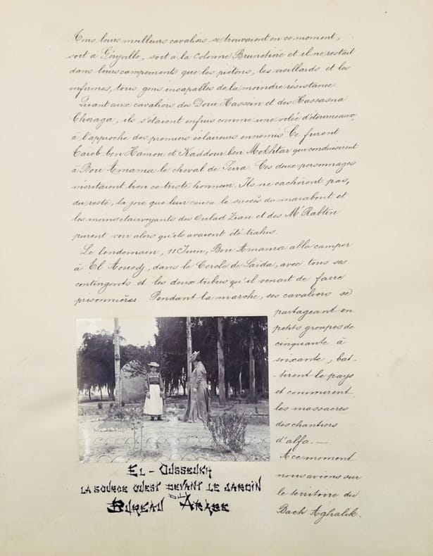 Biskra, , 1908-1909. Album in-4 manuscrit de (385) pp., 119 photographies sur papier albuminé (environ 110 x 80 mm) montées dans le texte, demi-chagrin prune à coins, dos lisse muet orné de filets dorés, titre et auteur en lettres dorées sur le plat supérieur, étiquette « Imprimerie Barthes Frères, Fabrique de registres » (reliure de l'époque).