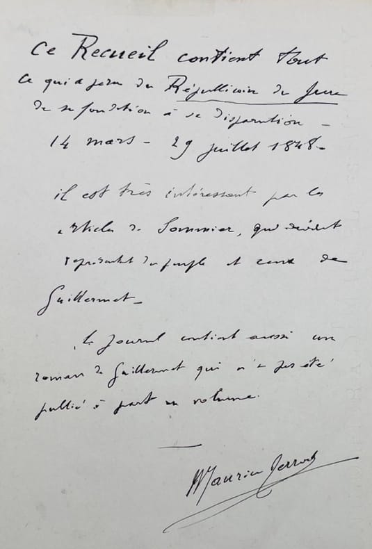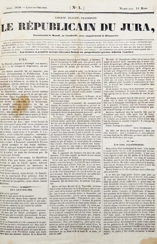 Collection complète de ce journal républicain qui prit la suite du Patriote jurassien. Journal publié à Lons-le-Saunier du 14 mars 1848 au 29 juillet 1848 pour le n°57, dernier numéro paru ; sa création est due à l’initiative de François Guillermet, gérant et surtout d’Antoine Sommier, rédacteur en chef. Imprimeur Courbet et Joseph Gresset. Dans la dernière livraison, le rédacteur annonce : « Nous prévenons nos abonnés que nous sommes forcés de suspendre la publication du Républicain du Jura, le procureur de la République ayant l'ordre de faire exécuter la circulaire ministérielle relative au cautionnement. Nous protestons de nouveau contre cette décision arbitraire, contre cette subite résurrection de lois monarchiques, que nous avions eu la simplicité de croire abrogées par la révolution de février. Néanmoins, résolus à faire tous les efforts et tous les sacrifices possibles pour conserver un organe dans le Jura, à la République démocratique, nous nous résignerons à subir le cautionnement, s'il nous est imposé légalement. Nous ne reconnaissons pas la loi de 1830, dont on se prévaut ; mais nous nous inclinerons devant un décret de l'Assemblée nationale ». Provenance : Maurice Perrod (prêtre, aumônier du Lycée Rouget de Lisle à Lons-le-Saunier, 1902), enrichi d’un feuillet autographe : « Ce recueil contient tout ce qui a paru du Républicain du Jura de sa fondation à sa disparition du 14 mars au 29 juillet 1848. Il est très intéressant par les articles de Sommier qui devient représentant du peuple et ceux de Guillermet. Le journal contient aussi un roman de Guillermet qui n’a pas été publié à part en volume ».Rare Journal du supplément au numéro 2.