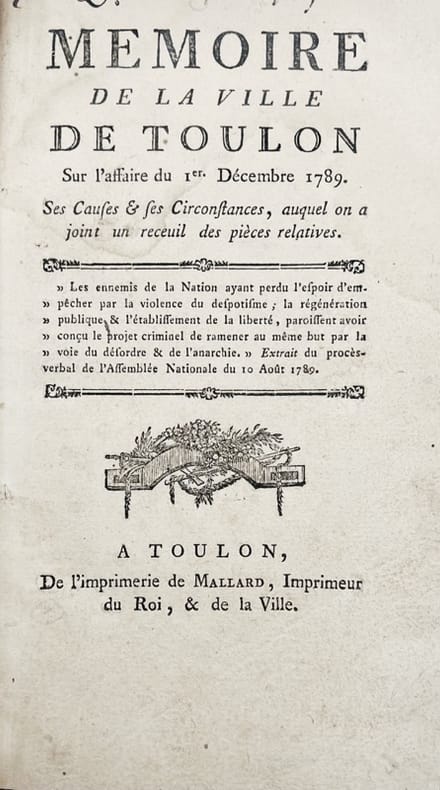 Édition originale. Récit circonstancié de la sédition de la ville en décembre 1789 quand les marins se mutinèrent après le renvoi de deux maîtres d'équipage et la défense faite aux ouvriers de l’Arsenal de porter la cocarde tricolore et de se faire inscrire dans la garde nationale. Le chef d'escadre d'Albert de Rioms commandant de la Marine à Toulon ainsi que plusieurs officiers furent arrêtés et emprisonnés par les Volontaires de la Garde Nationale de Toulon. Large et pâle mouillure sur les premiers feuillets. La Bédoyère, 1535.