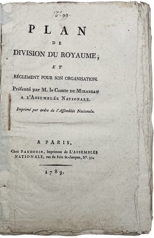 Très intéressante proposition faite au coeur du débat sur les divisions à instaurer dans le pays sur la ruine des circonscriptions traditionnelles. Mirabeau s'y montre sensible à la réalité et à l'histoire, et rejette le plan géométrique proposé par le Comité de constitution. Ses idées (120 départements, ni communes ni cantons) ne furent sur ce point pas adoptées. Martin & Walter, 24518. - - VENTE PAR CORRESPONDANCE UNIQUEMENT - LIEN DE PAIEMENT, NOUS CONSULTER.