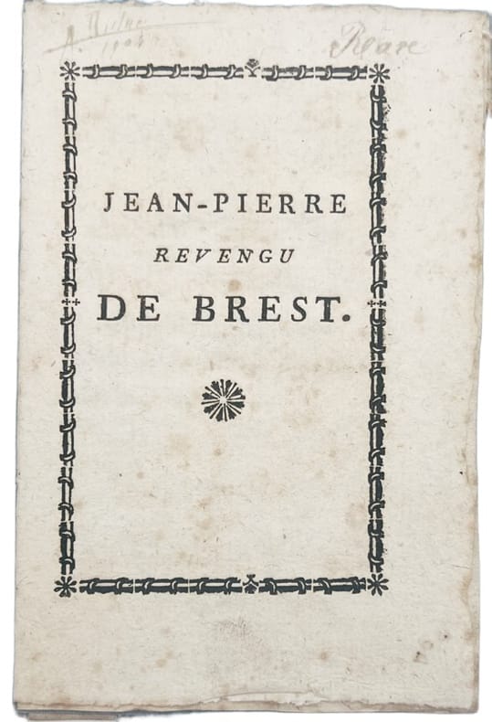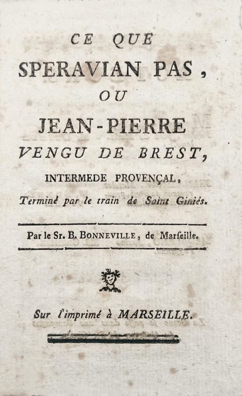 Rare livret de colportage imprimé en provençal à Marseille en 1790, quand il devint suspect d'écrire et de faire jouer des pièces en patois. Comédie en langue provençale donnée par la troupe de Bonnet-Bonneville qui occupait le « Théâtre Beauvau » du nom du Maréchal Prince gouverneur de Provence, qui devint l'Opéra de Marseille. Ces comédies séduisaient un large public mais le 12 mai 1794, le conseil municipal de Marseille interdit la représentation de pièces de théâtre en provençal, au motif que l’unité des Français devait exister jusque dans le langage.Suivi de la chanson en provençal : Per servir noustre pays Enfans , venen de la guerro : Et per la gloiro deis Lis, Fasian su mar è su terro, poun, poun, poun, Trambla l'Angleterro A coous de canoun.Ex-libris gravé « Joannis Antoni Nicola Episcopi Albensis 1832 » (évêque d'Aps aujourd'hui Alba la Romaine, Ardèche). Rousseurs.