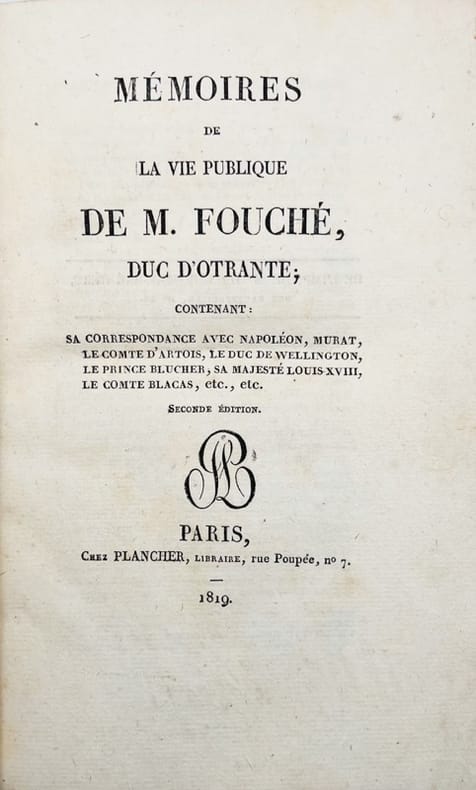 Deuxième édition, mais première parisienne (l'originale avait été donnée dès 1818 à l'adresse de Londres, Colburn). Il s'agit à la fois d'une esquisse des Mémoires auxquels l'ancien ministre de la police générale travaillait sans relâche depuis le début de son exil, et d'un nouveau ballon d'essai, destiné à favoriser les esprits à un retour en France, qui ne viendra pas.Cf. Waresquiel, Fouché, les silences de la pieuvre (Paris, 2014), p. 789.RELIÉES À LA SUITE : I. [REGNAULT-WARIN (Jean-Baptiste) :] Mémoires pour servir à la vie d'un homme célèbre [Napoléon dans sa vie privée / Napoléon homme public / Napoléon à Sainte-Hélène]. Par M. M***. Paris, Plancher [Imprimerie de Renaudière], 1819, [2] ff. n. ch., iv pp., 60 pp., 80 pp., 86 pp., 64 pp. Quatre premières parties (sur huit) de ce curieux recueil d'anecdotes auquel on fera bien de ne pas accorder trop de crédit. - II. GOURGAUD (Gaspard) : Campagne de dix-huit cent quinze, ou Relation des opérations militaires qui ont eu lieu en France et en Belgique, pendant les Cent Jours ; écrite à Sainte-Hélène. Paris, P. Mongie aîné [Imprimerie de Fain], 1818, [2] ff. n. ch., iv pp.,240 pp., un f. n. ch. de table, avec 5 planches dépliantes hors texte (une carte et 4 tableaux). Édition originale. Comme l'on sait, l'ouvrage est le fruit des entretiens de Napoléon avec Gourgaud sur sa dernière campagne : il reflète surtout la façon dont l'Empereur voulait que la postérité perçût son action. Davois II, 74. De Meulenaere, Waterloo, 127.Cachet humide de la bibliothèque de Leugny. - - VENTE PAR CORRESPONDANCE UNIQUEMENT - LIEN DE PAIEMENT, NOUS CONSULTER.