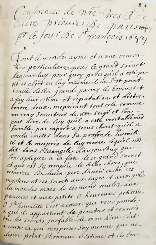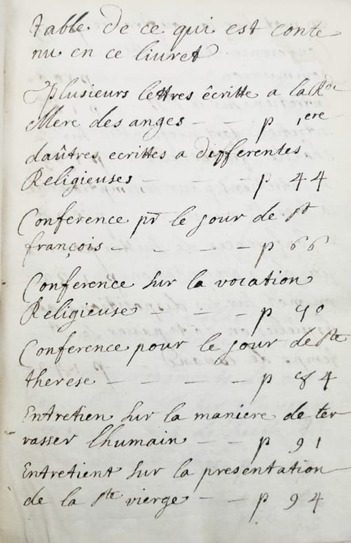 Recueil anonyme et manuscrit de lettres, entretiens et conférences de l'une des grandes figures du XVIIe religieux, Catherine de Bar, plus connue sous le nom de Mère Mectilde du Saint-Sacrement (1614-1698), fondatrice des Moniales bénédictines de l'adoration perpétuelle du Très-Saint-Sacrement (1653, à Paris).« Jeune moniale, alors qu'elle ne songe qu'à prier en paix en un obscur couvent de Lorraine, la guerre de Trente ans l'oblige à errer de refuge en refuge à travers le duché, puis à gagner Paris. Bientôt, elle doit se rendre en Normandie et s'établit enfin à Paris dans le faubourg Saint-Germain. Cédant aux instances de nobles et pieuses femmes, elle ouvre un monastère de Bénédictines vouées au culte de l'Eucharistie. Pour développer son œuvre, elle ne cessera de sillonner le royaume. À son décès, la jeune congrégation est en plein essor. » (Joseph Daoust).Le recueil s'ouvre par un corpus de dix-sept lettres sur la mort en 1687 de Soeur Marie des Anges, maîtresse des novices à Rouen, où Mère Mectilde était venue en 1677 fonder un nouveau monastère qui conserve aujourd'hui encore une grande partie des archives de la fondatrice, en partie autographes, en partie transcrites par des contemporains.Joint : lettre datée 15 février 1795 adressée à Mme St Ambroise (?) à Versailles au sujet d'un départ de Dreux pour Caen.Manuscrit « à l'usage de S[oeur]r de Ste Fare »(ex-libris manuscrit sur la garde supérieure), d'une écriture parfaitement lisible, ne comportant aucune rature, conservé dans sa reliure en vélin rigide de l'époque.