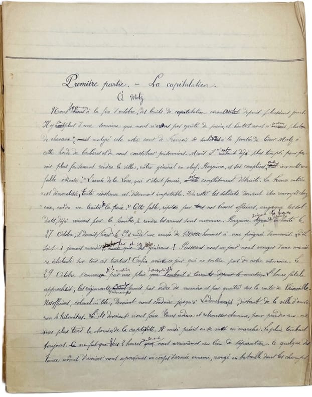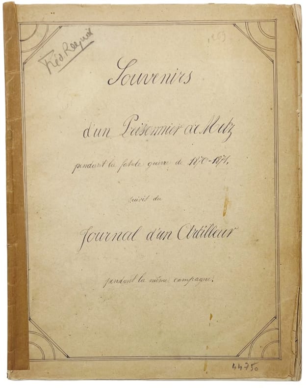 Court récit anonyme vraisemblablement inédit qui suit la colonne des prisonniers français partie de Metz après la capitulation, pour Wesel en Allemagne, à pied et en chemin de fer. « Nous sommes à la fin octobre, des bruits de capitulation circulent depuis plusieurs jours. Il y a plus d'une semaine que nous n'avons pas goûté de pain et bientôt nous n'aurons plus de chevaux ; malgré cela notre coeur de Français se soulève à la pensée de livrer Metz à cette horde de barbares et de nous constituer prisonniers. Mais il n'est déjà plus temps : pour pouvoir plus facilement rendre la ville, notre général en chef Bazaine et ses complices ont inventé une fable odieuse : « L'armée de la Loire qui s'était formée, est complètement détruite. La France entière est démoralisée, toute résistance est désormais impossible. Du reste les soldats doivent être renvoyés chez eux, car on va traiter de la paix. » Cette fable répétée par nos braves officiers engagea nos soldats déjà vaincus par la famine à rendre les armes sans murmure. Bazaine signe la honte le 27 octobre, il devait livrer le 29 à midi une armée de 12000 hommes à une poignée. Qu'il soit à jamais maudit lui et ses lâches généraux ! (…) C'en est fait, nous étions prisonniers de guerre. » Itinéraire en France : Les Étangs, Boulay et Tromborn : « Là, quoique le village soit voisin de la frontière on nous fit un accueil des plus amical. Les paysans venaient eux-mêmes dans le camp pour nous apporter du pain, du fromage des pommes et tout ce qu'ils avaient enfin. »Suivi de l'ébauche d'un journal de guerre du 21 juillet au départ de Privas au 4 septembre 1870. Plusieurs corrections ; manuscrit d'une écriture parfaitement lisible.