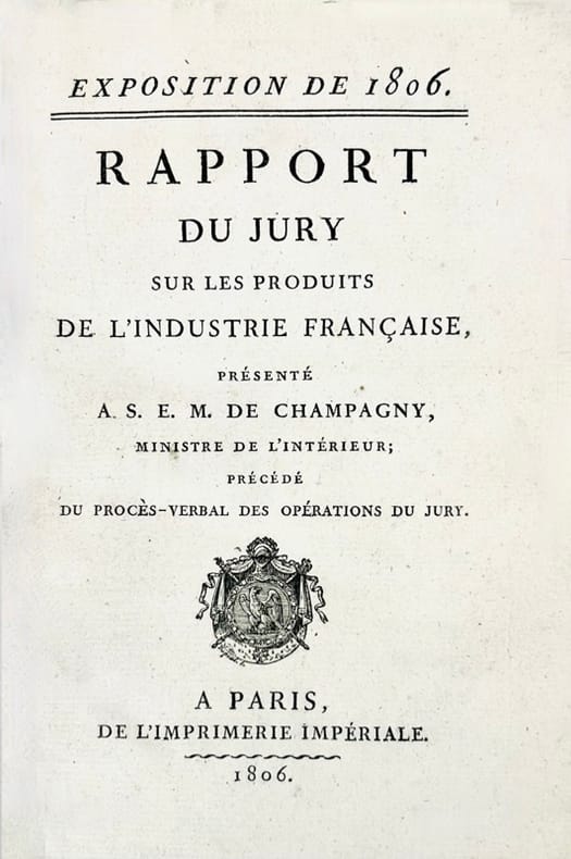 Dixième exposition des produits de l'industrie. Parmi les 44 membres du Jury central présidé par le baron Thénard avec pour vice-président le baron Charles Dupin et pour secrétaire général Payen, on trouve Michel Chevalier, Héricart de Thury, Charles Schlumberger, Adolphe Blanqui, Alexandre Brongniart, Girod de l'Ain, Firmin Didot, baron Séguier. 3960 exposants se réunirent pour présenter leurs produits jugés par huit commissions spéciales : Tissus, Métaux et substances minérales, Instruments de précision et Instruments de musique, Arts chimiques, Beaux-Arts, Arts céramiques, Arts divers. Table Alphabétique des fabricants et des artistes récompensés par le Jury Central de l'Exposition.