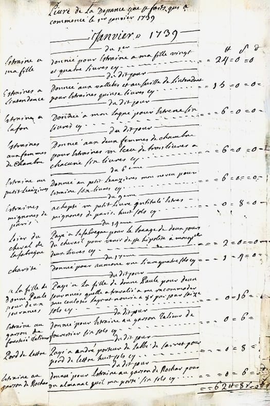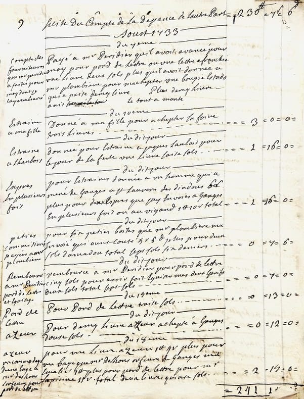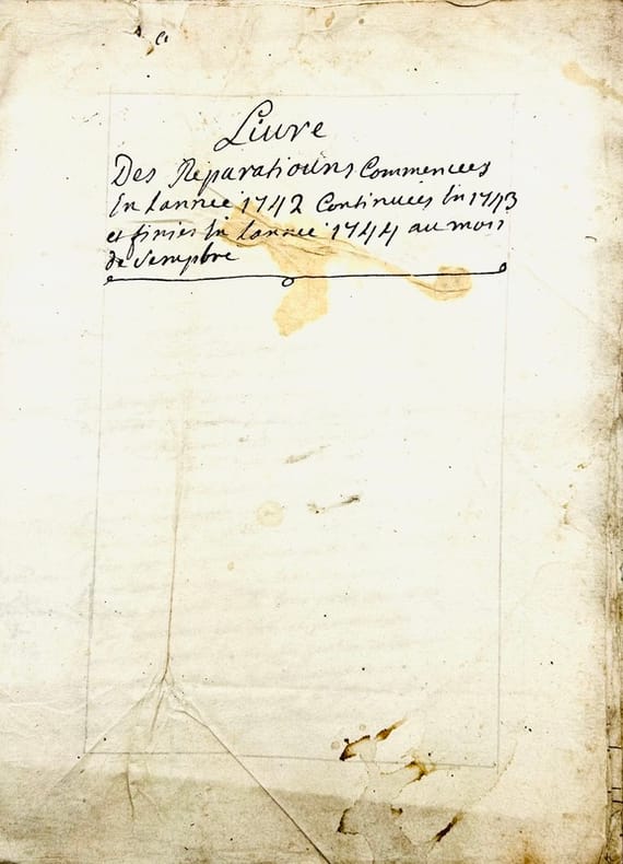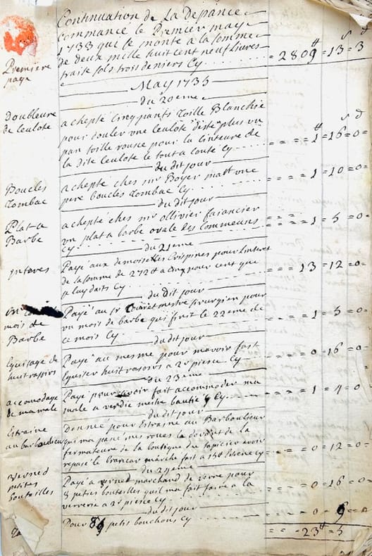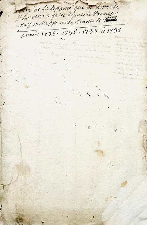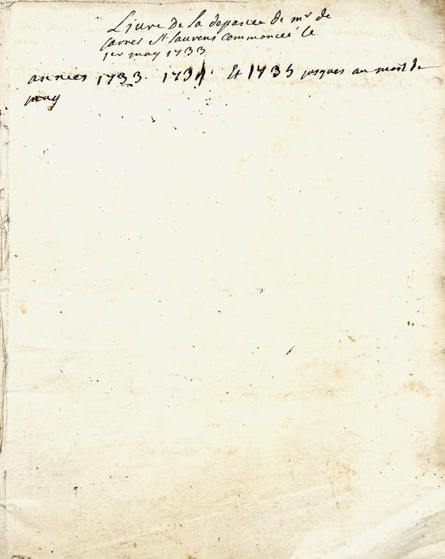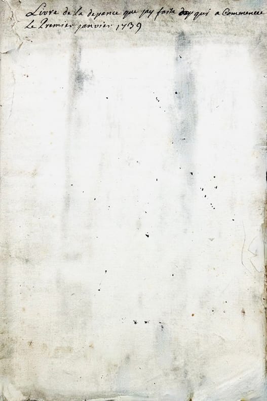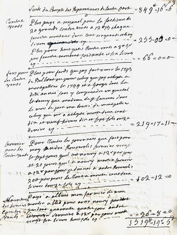 Livre de la depence de Mr Favret St Laurens commancée le 1er may 1733. Années 1733. 1734 et 1735 jusques au mois de may. In-4 de 68 pp. [Verso du dernier feuillet : Livre de la recepte de Mr Favret St Laurens commancée le Premier may mille sept cents trante et trois. In-4 manuscrit de 5 pp.].J'ay commancé mon tabac a rapé que Lacam ma porté de Paris le 27eme xbre 1731 y compris celuy que j'avais il y a en tout pois de montpellier quinze livres et demy. Mr de Régnac maporte duex carotes tabac faisant pois de montpellier sept livres…Livre de la Depance que Mr Favret de St Laurens a faite depuis le Premier May mille sept cents trante et cinq. Années 1735. 1736. 1737 et 1738. In-4 broché de 78 pp. Titre de départ : Continuation de la depance commancé le Premier May 1733 qui se monte à la somme de deux mille huit cent neuf livres traise sols trois deniers cy [Verso du dernier feuillet : Livre de la recette que Mr Favret de St Laurens a faite commencée le premier may mille sept cents trente trois / jay arraché les deux feules quimanquent a ce registre parce que cestoit la recepte que jay couché pourt un caier qui est dans mon portefeuille]. Livre de la depance que jay faite qui a copmmencé le Premier janvier 1739. [Au verso du dernier feuillet : ce patot contient toutes les dépanses que jay faites depuis le 1er may 1733 et les années suivantes 1734 1735 1736 1737 et 1738.]Fin : La depance que jay faite depuis le premier janvier 1739 jusques au dernier décembre mille sept cents quarante et un se porta à la somme de deux mille neuf cents septante livres cin sols onze deniers. In-4 de (2)-48-(31) pp. Livre des réparations commencées en lannée 1742 continuées et finies en lannée 1744 au mois de septembre. In-4 de (14) ff.