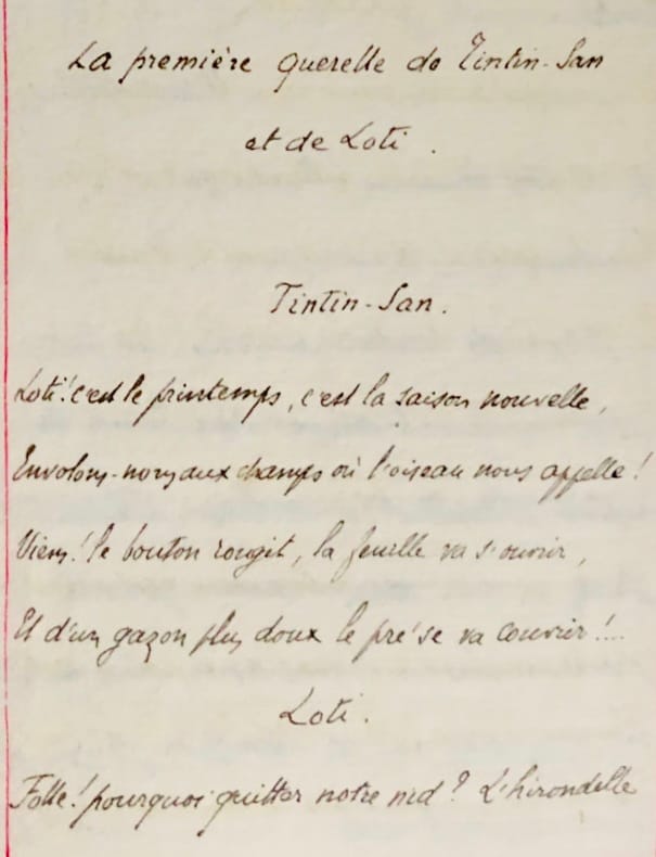 Manuscrit anonyme, conçu comme une suite naturelle à Madame Chrysanthème de Pierre Loti (1887) il s'inscrit dans le contexte de la vogue japonaise qui marque la fin du XIXe siècle en France. Rédigé dans un style mêlant prose et poésie, il reprend les protagonistes du roman original, tout en introduisant de nouveaux éléments narratifs et thématiques.Le narrateur, identifiable comme Loti lui-même, évoque la genèse de cette suite dans une préface teintée d'une légèreté complice : « L'occasion c'est vous qui eûtes le privilège de la fournir : ce sont toujours les femmes qui mettent le feu aux poudres, c'est d'elles que part l'étincelle. Un livre de P. Loti que vous aviez lu vous plaît, vous désirez savoir s'il me plaira aussi, vous me le prêtez : le lendemain cet ouvrage avait une suite, Chrysanthème une rivale, Loti un nouvel amour... »Le récit conserve son cadre à Nagasaki, où les personnages du roman initial – Loti, son frère Yves, Chrysanthème, et Madame Prune – gravitent autour d’une nouvelle figure féminine, Tintin San, décrite comme une « mousmé » née en 1888. Ce terme, introduit en France par Loti, contribue à l’imagerie exotique qui séduisit le public français.La structure narrative se distingue par son dialogue entre prose et poésie. Cette alternance confère à l’oeuvre une tonalité ludique et légère, tout en explorant les thèmes de l’amour éphémère et de l’exotisme. Une strophe emblématique traduit la fragilité des sentiments et des relations :Je ne suis qu'une pauvre fleur ;Sans parfum comme sans couleur !Tintin San me cueille et m'oublie !Loti me reçoit, puis - folie -Pour me punir de ma pâleurDans un in-folio me plie,Sans parfum, comme sans couleur…Je ne suis qu'une pauvre fleur !Une des premières manifestations de la mode japonaise. Cette oeuvre, bien que mineure dans la production littéraire de son époque, illustre l’impact durable de Madame Chrysanthème sur la fascination française pour le Japon. En adoptant le prisme de la fantaisie amoureuse et en jouant sur les codes de l'exotisme, elle témoigne de la manière dont le roman de Loti a inspiré une série de créations littéraires et artistiques.Conclusion : entre hommage et parodie. Ce texte se situe à la croisée de l’hommage à Loti et de l’interprétation fantaisiste de son univers. Ancrée dans le japonisme fin-de-siècle, cette suite anonyme prolonge les aventures sentimentales du narrateur, tout en participant à l’élaboration d’une image idéalisée et romancée du Japon, qui allait marquer durablement l’imaginaire collectif européen.