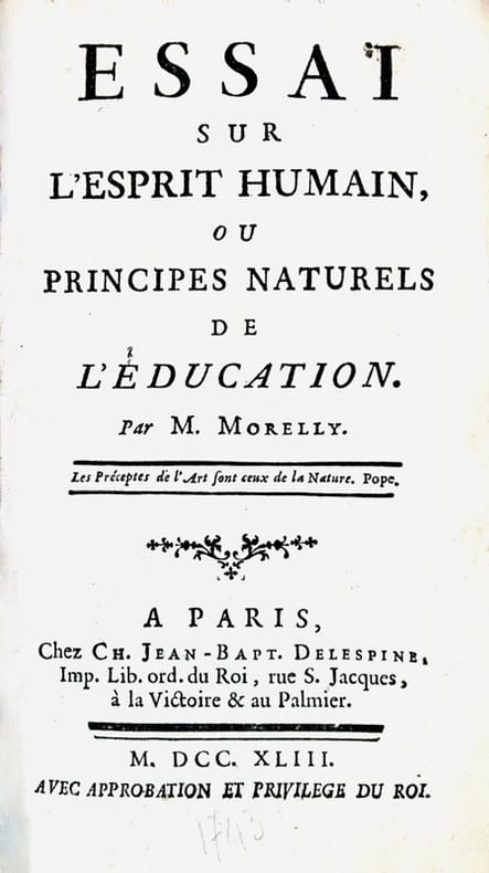 Édition originale. Premier ouvrage de Morelly, avant son explosif Code la nature (1755) dans lequel il tend à vouloir détruire les « îles flottantes ».Dans ce petit traité d'éducation, dont Rousseau se serait inspiré, Morelly démontre que l'enfant est sensible avant d'être raisonnable : « J'écris pour l'homme et je le prends dès son enfance : j'observe les mouvements de son esprit et les progrès de ses connaissances ; et comme il est sensible avant que d'être raisonnable, c'est en épiant ses sensations que je cherche à découvrir les premiers pas que la raison lui fait faire ».