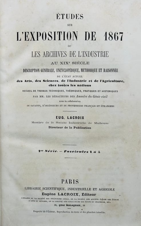 Collection complète de cette publication consacrée à la deuxième exposition universelle française par Eugène Lacroix, directeur de la publication, membre de la Société industrielle de Mulhouse. Très rare complet des deux atlas.