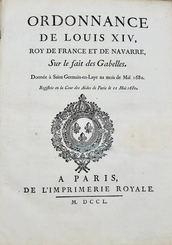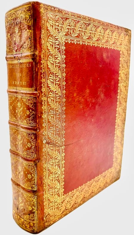 Recueil cohérent, vraisemblablement édité tel quel par l'Imprimerie Royale, et donnant l'essentiel de la réglementation sur la fiscalité indirecte : gabelles, aides, droits divers, ainsi que sur leur affermement. Aujourd'hui comme hier, c'est la fiscalité indirecte qui assure l'essentiel des revenus publics. I. Ordonnance de Louis XIV, Roy de France et de Navarre, sur le fait des gabelles. Donnée à Saint-Germain-en-Laye au mois de mai 1680. Registrée en la Cour des Aides de Paris le 11 mai 1680. Paris, Imprimerie Royale, 1750, [4]-107 pp. II. JAQUIN (Jacques) : Conférence de l'Ordonnance de Louis XIV, Roy de France et de Navarre, sur le fait des entrées, aides & autres droits, pour le ressort de la Cour des Aides de Paris. Avec celles des Rois prédécesseurs de Sa Majesté. Enrichies d'explications & décisions importantes. Paris, Imprimerie Royale, 1751. [6]-434 pp.III. Ordonnance de Louis XIV, Roy de France et de Navarre, sur le fait des aides & autres droits y joints dans la province de Normandie. Donnée à Fontainebleau au mois de juin 1680. Registrée en la Cour des Aides de Rouen le 26 février 1681. Paris, Imprimerie Royale, 1750, [4]-108 pp.IV. Ordonnance de Louis XIV, Roy de France et de Navarre, servant de règlement sur plusieurs droits de ses fermes, & sur tous en général. Donnée à Versailles le 22 juillet 1681. Registrée en la Cour des Aides de Paris le 21 août 1681. Paris, Imprimerie Royale, 1750, [4]-64 pp.V. Ordonnance de Louis XIV, Roy de France et de Navarre, sur le fait des cinq grosses fermes. Donnée à Versailles au mois de février 1687. Registrée en la Cour des Aides le 8 mars suivant. Paris, Imprimerie Royale, 1750, [4]-47 pp.VI. Tarif général des droits des sorties et entrées du Royaume, et des provinces desquelles les bureau ne sont établis ; ordonnés être levés sur toutes les marchandises & denrées. Arrêté au Conseil royal le 18 septembre 1664. Avec l'édit du Roy, portant réduction & diminution des droits de sorties & entrées sur les denrées & marchandises ; suppression de la nouvelle imposition d'Anjou, des tabliers établis pour la levée d'icelle, des droits appelés de massicault [droits sur la pêche des poissons en Normandie], & autres : et règlement pour la perception desdits droits. Donné à Vincennes au mois de septembre 1664. Paris, Imprimerie royale, 1750, 128 pp.Provenance : Antoine-Augustin Thomas du Fossé (1712-1787), conseiller en la Grand-Chambre du Parlement de Rouen, appartenait au Parlement depuis 1737 ; petit-neveu du pensionnaire de Port-Royal, allié aux Arnauld, gallican et libéral, il fut au Parlement l’un des chefs de l’opposition sous Louis XV, et subit plus d’une fois les rigueurs de la Cour.Bel exemplaire. Quelques traces de restauration.