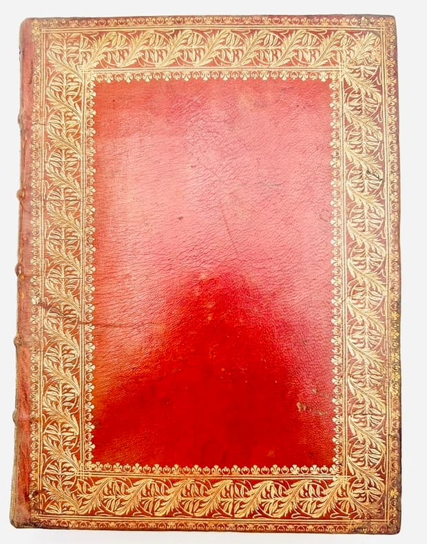 Paris, , 1750-1751. 6 pièces en 1 fort vol. in-4, maroquin vieux-rouge, dos à nerfs richement cloisonné et fleuronné, large encadrement doré de doubles filets, large guirlande intérieure et petites frises fleurdelisées extérieures sur les plats, double filet doré sur les coupes, tranches dorées, dentelle intérieure (reliure de l'époque).