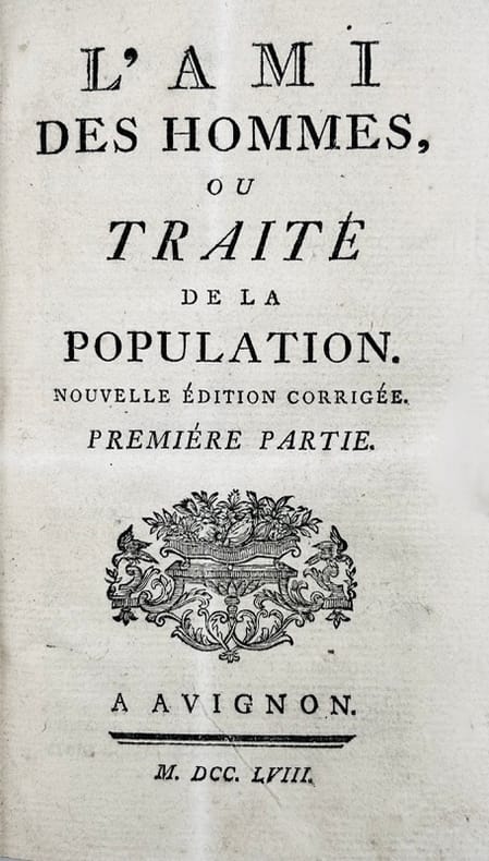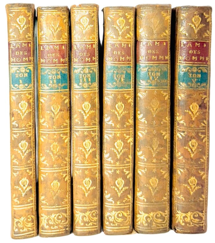Le Marquis de Mirabeau publia en 1756 cet ouvrage dont le titre devait faire fortune au point de devenir le sobriquet de celui qui l'avait composé : L'Ami des hommes, recueil d'essais qui préfigure les physiocrates ; Mirabeau a rassemblé « des morceaux épars et négligés qu'il avait laissés couler de sa plume ». La thèse fondamentale de L'Ami des hommes, est que la population est la source de toute richesse ; l'auteur se propose de démontrer l'utilité d'une population nombreuse et aisée. Mais l'ouvrage comporte aussi un éloge de l'agriculture, art par excellence, et une théorie de la liberté du commerce. On y trouve aussi des propositions de réforme sociale : le Marquis de Mirabeau est un adepte du travail obligatoire pour tous. Un ton à la fois prophétique et familier fit le succès du livre, l'auteur étant parvenu à dire au moment convenable ce que tout le monde pensait plus ou moins. Les souverains d'Europe consultèrent celui que l'on n'appelait plus que « l'ami des hommes » et le docteur Quesnay, médecin de Mme de Pompadour et chef d'école des physiocrates, séduit par l'ouvrage, le rallia à sa cause. Volumes I à III : L'Ami des Hommes ou Traité de la population. Volume IV : Précis de l'Organisation ; ou Mémoire sur les Etats provinciaux. Réponse aux objections contre le Mémoire sur les Etats provinciaux. Questions intéressantes sur la Population, l'Agriculture et le Commerce. Volume V : Mémoire sur l'Agriculture. Volume VI : Réponse à l'Essai sur les Ponts et Chaussées, la Voirie et les Corvées. Tableau oeconomique avec ses explications (six tableaux repliés). Assez bel exemplaire. Petit accident en pied du tome II.