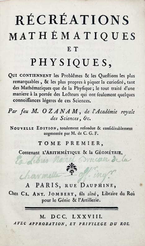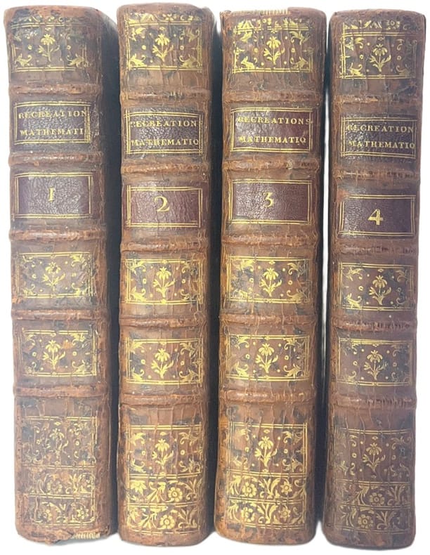 Nouvelle édition refondue et augmentée par M. de C. G. F., illustrée par 89 planches hors-texte. Ouvrage de science amusante divisé en problèmes : Arithmétique, géométrie, musique, optique, gnomonique, cosmographie, mécanique, acoustique, pyrotechnie, physique, horloges d'eau, phosphores naturels, lampes perpétuelles, etc.Bon exemplaire malgré une coiffe et un coin usés.