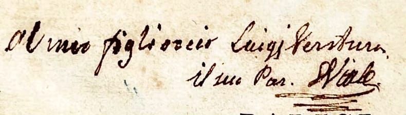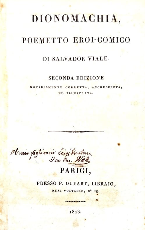 Envoi autographe signé sur la page de titre : Al mei figlio veio Luigi Ventura il me S. VIALE.Deuxième édition illustrée d'un frontispice. L'édition originale fut imprimée à Bastia en 1817. Le chef-d'oeuvre littéraire du magistrat et poète corse de langue italienne Salvatore Viale (Bastia 1787-1861) célèbre pour son poème U sirinatu di Scapinu, le premier texte publié en langue corse (chant IV, stances XLI-L avec notes en bas de page).Poème héroï-comique, la Dionomachia ou « la guerre de l’âne » raconte sur le mode burlesque une querelle les habitants de Borgo et de Lucciana, à propos du cadavre d’un âne, durant la Semaine Sainte de 1812.Des rousseurs (fortes par endroits) mais bon exemplaire.