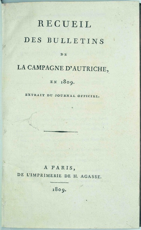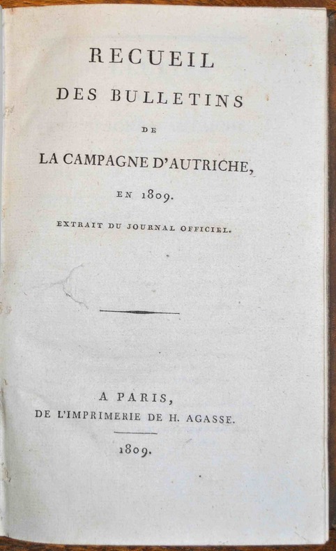 Rare recueil des trente bulletins de la campagne d'Autriche parus au Journal officel du 24 avril 1809 au 30 juillet suivant. Bel exemplaire. Manque à la BNF. 1 exemplaire au Catalogue collectif de France (Ministère des Affaires étrangères).