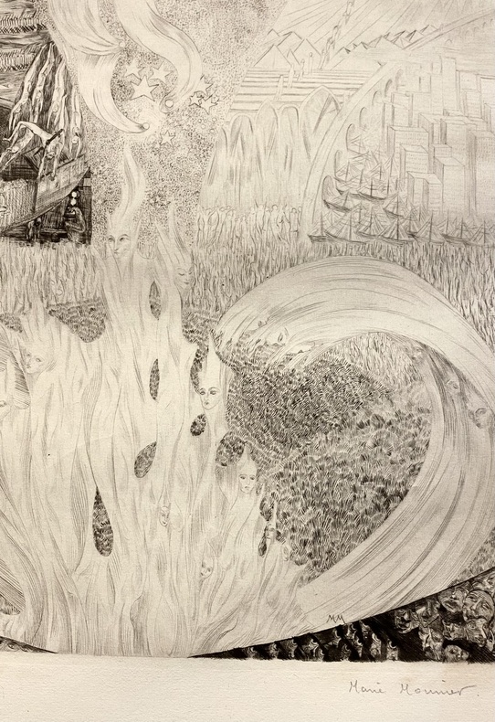 Marie Monnier (1894-1976) sœur cadette de la libraire Adrienne Monnier fut surtout connue comme brodeuse. Elle a laissé quelques rares gravures tirées pour ses seuls proches et n’a illustré que deux livres : Moralités de Paul Valéry et les Ludions de Léon Paul-Fargue. L’artiste resta d’une grande discrétion et, préfaçant le catalogue d’une exposition qu’elle donna en 1927, Fargue notait : « Nous sommes les contemporains de quelques maîtres et de quelques chefs-d’œuvre. Nous n’y faisons pas attention, nous ne prenons pas leur mesure parce qu’ils vivent à nos côtés et que nous pouvons les voir sans peine. Un sage a dit, je ne sais plus où, que si on nous annonçait pour le lendemain l’arrivée au Museum d’une troupe de sirènes, nous n’irions pas. »
