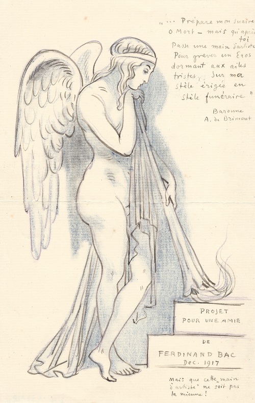 – Dessin à la plume et au crayon de couleur : Napoléon dépose une couronne de lauriers sur la tête de la poétesse transformée en statue égyptisante. Signé et daté 15 août 1911. 170 x 125 mm. – Dessin à la plume et aux crayons de couleur : le couronnement de Phryné. Signé et daté juin 1913. 180 x 135 mm. Le prix Archon-Despérouses de l’Académie française venait de lui être attribué pour Tablettes de cire. – Dessin à la plume et au crayon de couleur. « Projet pour une amie ». Signé et daté décembre 1917. 205 x 135 mm. Il est accompagné de quelques vers de Renée de Brimont. « … Prépare mon suaire ô mort – mais qui après toi passe une main d’artiste Pour graver un Eros dormant aux ailes tristes, sur ma stèle érigée en stèle funéraire », qui seront publiés en 1919 dans son recueil Mirages. – Lettre autographe signée « votre dévot Hortensius ». 2 pp. in 8°, enrichie d’un dessin au crayon légendé « La Fugitive ». Versailles, 30 juin 1922. « […] Comme je vous remercie de m’avoir envoyé cette « Fugitive ». je la garde prisonnière, mais je lui permettrai d’errer parmi les constellations et aussi d’aller remercier sa traductrice qui est une vraie créatrice et une poëtesse par la grâce des muses. » Les éditions Gallimard venaient de publier La Fugitive de Rabindranath Tagore dans une traduction de Renée de Brimont. Ferdinand Bac (1859-1952), écrivain, illustrateur, caricaturiste, qui serait le petit-fils de Jérôme Bonaparte, entretint une amitié de plus de trente ans avec Renée de Brimont. Les lettres qu’il lui adressa, vendues aux enchères en 2013 attestent leur complicité et leur confiance réciproque