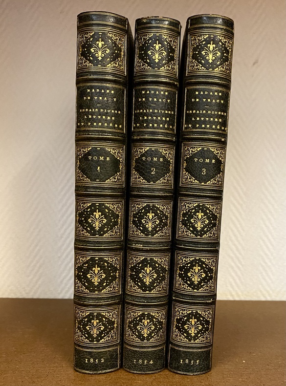 ÉDITION ORIGINALE. Sarah Newton (1789-1850) de la famille d'Isaac Newton, arriva très jeune en France où elle fut élevée dans l'entourage de la marquise de Coigny. Veuve jeune du général Letort elle épousa en 1816 Victor de Tracy., le fils du philosophe Antoine Destutt de Tracy. Très cultivée, elle consacra dès sa jeunesse une grande part de son temps à l'étude tout En ayant une certaine liberté d'allure et de sentiment dont l'écho se retrouve dans son journal. Tant Cuvillier-Fleury que Sainte-Beuve (Lundis, XIII) lui consacrèrent une notice. Ces trois volumes ne représentent qu'une partie de ses écrits : Tome 1 : un récit de voyage à Plombières en 1808 en compagnie de Mme de Coigny, alors qu’elle avait dix-huit ans : elle y raconte le voyage, la cure, les excursions, les mondanités, les lectures — – une nouvelle « Martha » (traduction libre de l’anglais). Elle se déroule à Londres où la malédiction d’une bohémienne s’abat sur une famille. – Un « Essai sur le mariage » (Roman imité de l’anglais). Promise à un duc, Lady Julia lui préfère un jeune homme beau et désargenté persuadée que la solitude d’un désert lui plairait avec lui… –– Tome 2 : Longue notice sur Destutt de Tracy – des essais sur saint Ambroise, saint Athanase et Tertullien – Tome 3 : Journaux et souvenirs (1843-1847) – Maximes et lettres.