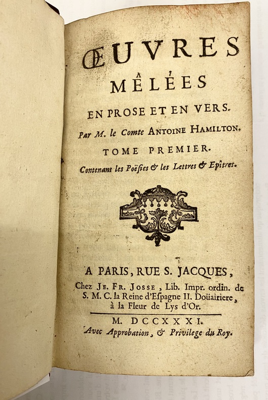 Le volume contient : Poésies — Lettres et épistres — Chansons — Zeneyde. (Jones, 45). Bel exemplaire. Deux fois exilé en France (lors de la révolution cromwellienne, puis à l’avènement de Guillaume d’Orange sur le trône d’Angleterre), cet ancien soldat choisit le français comme langue d’écriture et es surtout connu pour les Mémoires du comte de Gramont. Mais on lui doit aussi nombre de poésies et de contes.