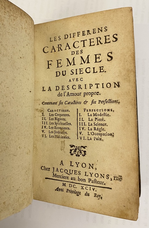 Édition parue à la date de l’originale donnée à Paris. Mme de Pringy sur laquelle les données biographiques manquent, fut une proche de Bourdaloue à qui elle consacra une biographie parue en 1705, et fait dans cet ouvrage œuvre de moraliste. Dans les Différens caractères, elle propose un portrait de ses contemporaines dont elle décrit les six défauts principaux (les « caractères ») : coquetterie, bigoterie, bel esprit, avarice, amour du jeu et des divertissements, esprit de chicane. Elle leur oppose les six perfections qui devraient corriger ces défauts : La modestie, la piété, la science, la règle, l’occupation, la paix. Pour elle, l’amour-propre est le moteur de tous les défauts des femmes et elle reviendra dans d’autres de ses ouvrages sur ce trait de caractère dominant. Enfin elle fustige la mauvaise éducation donnée aux femmes responsable de leurs errements.