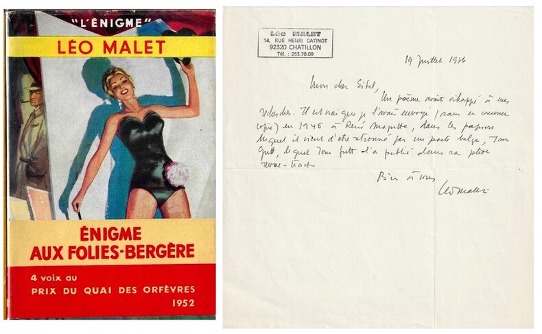 Editions Hachette / Collection " L'Enigme " 1952. In-12 broché de 191 pages au format 18 x 12 cm. Dos carré. Couverture avec titre imprimé. Complet de la superbe jaquette illustrée et de la bande annonce. Petit renforcement en haut du verso de la jaquette. Edition originale en superbe état général. Précieux exemplaire enrichi d'une belle lettre autographe signée et datée de Léo Malet à Alfred Eibel où l'auteur parle de René Magritte. La lettre est pliée.