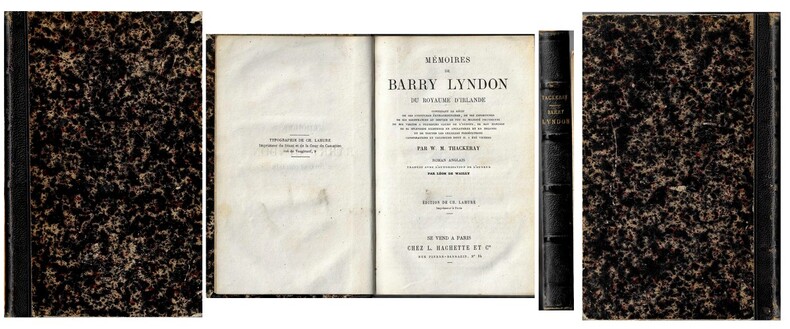 Edition de Ch. Lahure, imprimeur à Paris. Se vend à Paris chez L. Hachette & Cie, sans date ( 1860 ). In-12 relié de 294 pages au format 18 x 11,5 8 cm. Sobre reliure d'époque demi chagrin marrron, avec plats et pages de garde en papier marbré. Dos rond à 4 nerfs. Plats avec petits frottis aux coins. Intérieur frais malgré un minuscule manque au coin supérieur droit de la page 197. Quelques rarissimes rousseurs éparses. Edition originale de la traduction française établie par Léon de Wailly et autorisée par l'auteur. Rare sutout dans un tel état de fraicheur.Ce livre fut adapté à l'écran par Stanley Kubrick en 1975, avec dans les rôles principaux Ryan O'Neal, Marisa Berenson, Léon Vitali, Dominic Savage, Patrick Magee, Hardy Krüger, etc.