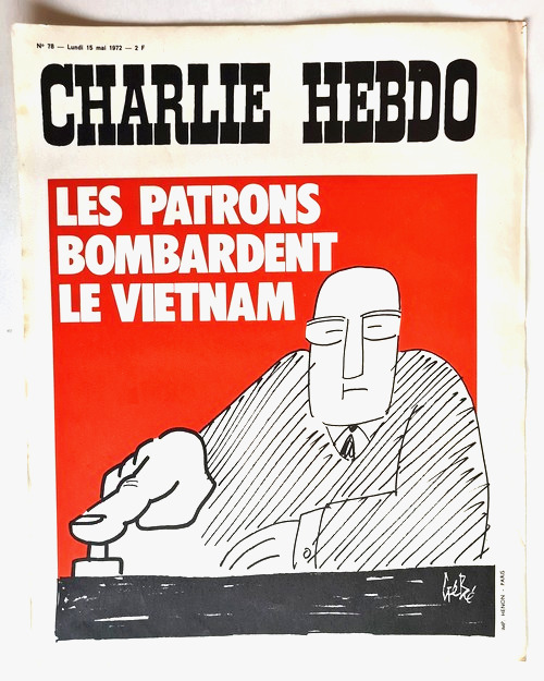 Rare affichette publicitaire pour kiosque Charlie-Hebdo n° 78 du lundi 15 mai 1972 : Les patrons bombardent le Vietnam. Format 38 x 29 cm. Couverture illustrée en offset par Gébé. L'image et les contraste sont malheureusement accentués par l'appareil photo, car l'exemplaire est dans un magnifique état de fraicheur, très blanc et très propre et non plié. Rarissime édition originale.