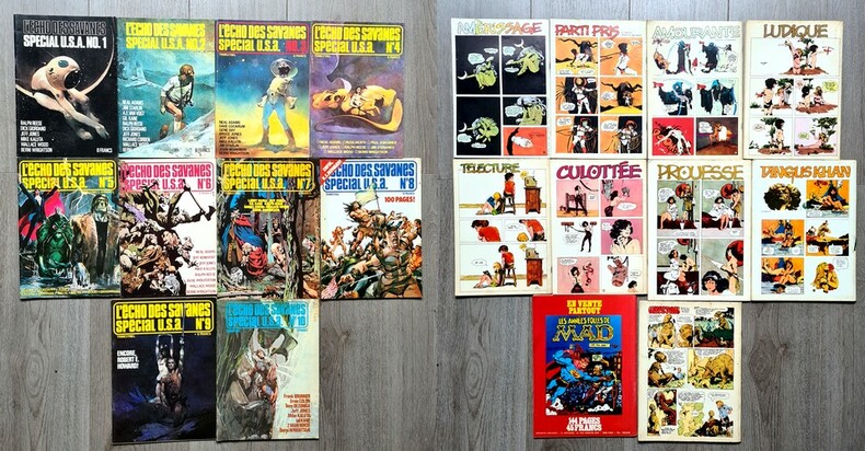 Editions du Fromage / Revue trimestrielle, L'Echo des Savanes, " Spécial U.S.A ". Tête de série du magazine n° 1 à 10 de 1976 à 1979. In-8 agrafé d'environ 70 pages chacun au format 27 x 18,5 cm puis à partir du n° 7, 28 x 20,5 cm. Couvertures illustrées en couleurs par Jeffrey Jones, Neal Adams, Berni Wrightson. Contient les 2 numéros spéciaux entiérement consacrés à Robert Erwin Howard ( n° 8 avec magnifique portfolio Conan et n° 9 ). Bandes dessinées en noir avec de nombreux dessinateurs dont : Neal Adams, Barry Windsor Smith, Roy Thomas, Wallace Wood, Esteban Maroto, Berni Wrightson, Wallace Wood, Jeff Jones, Mike Kaluta, Gil Kane, etc. Rare tête de série des 10 premiers numéro. Edition originale en superbe état général de fraicheur.