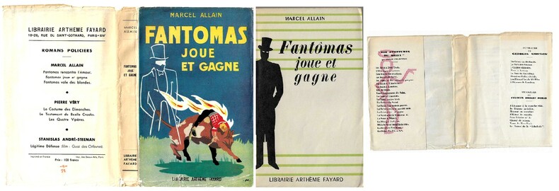 Editions Arthème Fayard 1947. In-12 broché de 285 pages au format 19 x 12 cm. Couverture illustrée. Dos carré. Plats et intérieur frais, malgré un nom inscrit en page de garde. Complet de la rare et magnifique jaquette illustrée signée PHD. Cette dernière présente de petits frottis, et plis, mais n'a subie aucune restauration. Complet de la feuille publicitaire pour les " Œuvres Libres ". Edition originale d'un des derniers " Fantômas " écrits par Marcel Allain seul. Rarissime, avec jaquette et dans un tel état de fraicheur.
