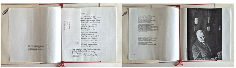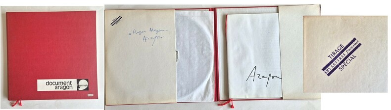 Editions L'Apostrophe / Fidélio 1968. Coffret, pleine toile rouge, avec vignette de titre au format 31,5 x 32 cm. Contient un disque vinyle, 33 tours, enregistré au domicile de Louis Aragon le 4 juillet 1968, ainsi que'un livret de 26 pages, relié par une tresse de soie rouge reproduisant 14 poèmes inédits, dont un en facsimilé autographe. Photographie en noir du poète en milieu du livret. Tirage unique à 400 exemplaires numérotés sur Vergé Ingres de Lana. Le notre est un des 100 exemplaires hors-commerce réservés aux " Lettres Françaises ", mais non numéroté. Exemplaire offert par Louis Aragon, enrichi, d'une cordiale dédicace de Louis Aragon à Roger Mayer, qui fut résistant et Professeur de Physique-Chimie. Très rare édition originale en superbe état général et en tirage de luxe.