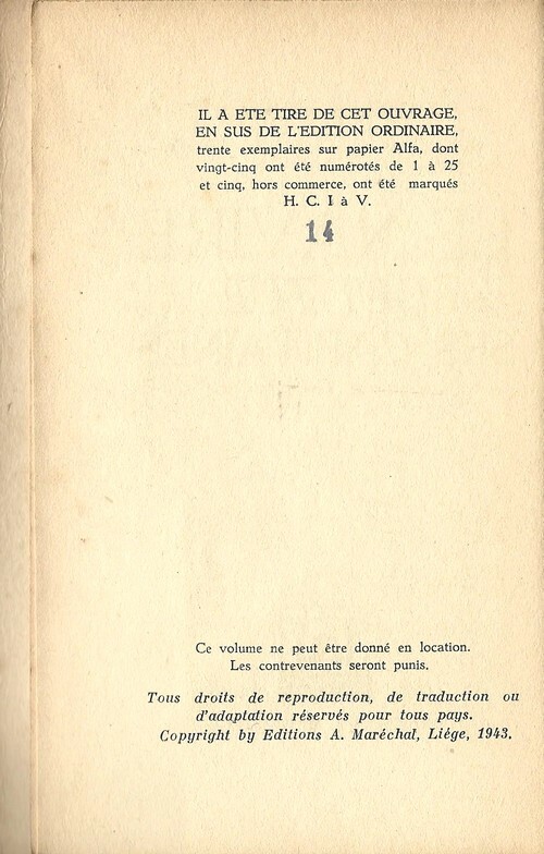 Editions Le Sphinx / Maréchal, Liège 1943. In-12 broché de 201 pages au format 18,7 x 1,5 x 12,5 cm. Couverture avec petite illustration et titre en rouge et noir. Dos carré, légèrement insolé avec sept microscopiques brunissures sur le haut. Plats avec bords et mors très, très légèrements brunis. Intérieur frais. Magnifique état général. Un des 30 exemplaires numérotés sur alfa ( n° 14 ) du tirage de tête, seul grand papier. L'ouvrage est un peu plus épais que l'édition courante. Rarissime édition originale de ce roman, surtout en grand papier et dans un tel état de fraicheur.