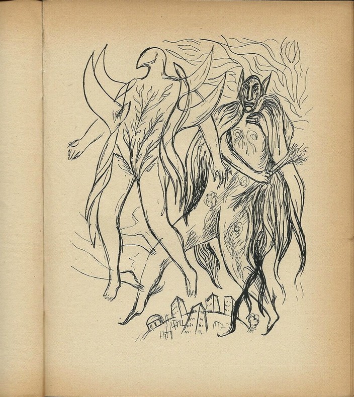 Editions Le Temps Perdu 1943. In-8 broché de 72 pages au format 17,5 x 22 cm. Couverture rempliée avec titre imprimé. Dos carré, muet. Plats frais avec petite insolation en haut des couvertures. Intérieur frais. Exemplaire non coupé. Six superbes illustrations en noir, hors texte, de l'auteur. Tirage unique à 950 exemplaires numéroté sur médiocre vergé nelson, ( n° 474 ), après 15 madagascar, 20 montgolfier et 6 pur fil. Edition originale en superbe état général.