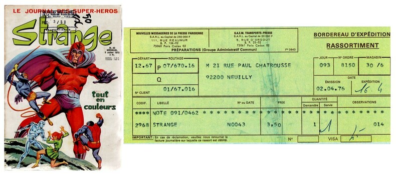 Editions Lug / Strange n° 43 du 5 juillet 1973. In-4 broché de 88 pages au format 24 x 17 cm sous belle couverture illustrée. Dos carré. Plats et intérieur frais. Exemplaire hors commerce avec cachet de réassortiment " N.M.P.P " en haut de la couverture, n° de réassort au feutre et bien complet du bordereau d'expédition pour le rassortiment. Contient les séries : Les X-Men, Iron Man, Daredevil, et Spider-Man. Superbe état général. Rare édition originale.