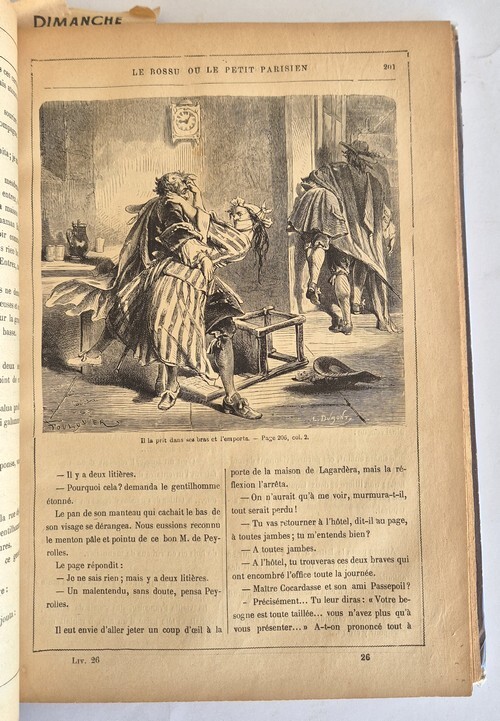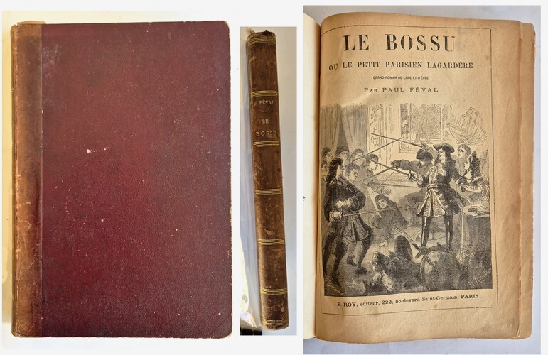 Paris, F. Roy éditeur, 222, boulevard Saint-Germain sans date ( 1875 ). In-4 relié de 474 pages au format 28,5 x 4 x 19,5 cm. Reliure éditeur demi basane marron avec plats en plein chagrin. Dos rond avec filets et titre doré. Pages de garde en papier marbré. Petits frottis aux coins et aux mors. Intérieur assez frais vu l'extrème fragilité du papier. Restauration au scotch transparent au bas des pages 249 et 250. Complet de la couverture illustrée et de deux frontispices. L'un étant un portrait de Paul Féval et l'autre un portrait de Mélingue, créateur du rôle du bossu. A noter que le portrait de l'auteur porte la mention : H.Geffroy éditeur. Textes sur deux colonnes avec magnifiques illustrations en noir par Fourquier, Trichon et Riballier. Edition originale illustrée en assez bel état général.