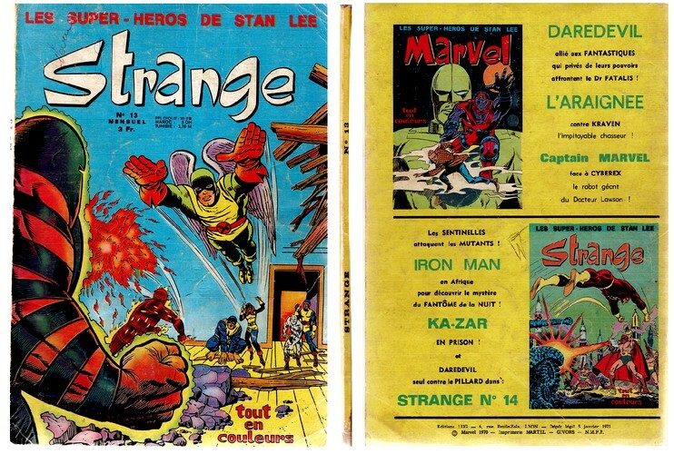 Editions Lug. Strange n° 13 du 5 janvier 1971. In-4 broché de 80 pages au format 24 x 17 cm sous belle couverture illustrée. Dos resté carré avec infimes brunissures. Infimes frottis aux mors et aux coins, avec petites traces de pliure. 3 petites traces de stylo sur les plats. Intérieur frais avec une petite bavure rouge au bord de la dernière pages. quelques rares brunissures sur la tranche extérieure. Contient les séries : Les X-Men, Iron Man, Daredevil, Ka-Zar et Le Surfer d'Argent. Rare édition originale en assez bel état général de fraicheur.