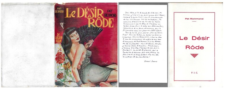 Editions P.I.C 1954. In-12 broché de 222 pages au format 19 x 12 cm. Couverture avec titre imprimé en rouge. Dos carré. Plats et intérieur frais. Exemplaire non coupé. Complet de la rare et superbe jaquette illustrée par Jacques Leclerc dit Jihel, avec une belle Pin-Up. A l'exception d'un petit frottis au dos, cette dernière est en état magnifique et n'a subi aucune restauration. Exceptionel état de fraicheur, proche du parfait. Rarissime édition originale de ce roman érotique de Henri Vernes, écrit sous le pseudonyme de Pat Richmond. Indispensable à tout collectionneur d'Henri Vernes. On joint une feuille explicative sur l'écriture de ce texte, reproduisant une lettre d'Henri Vernes en fac-similé autographe. Cette feuille accompagnait le tirage Ananké, réalisé en 2009 et tiré à 350 exemplaires.