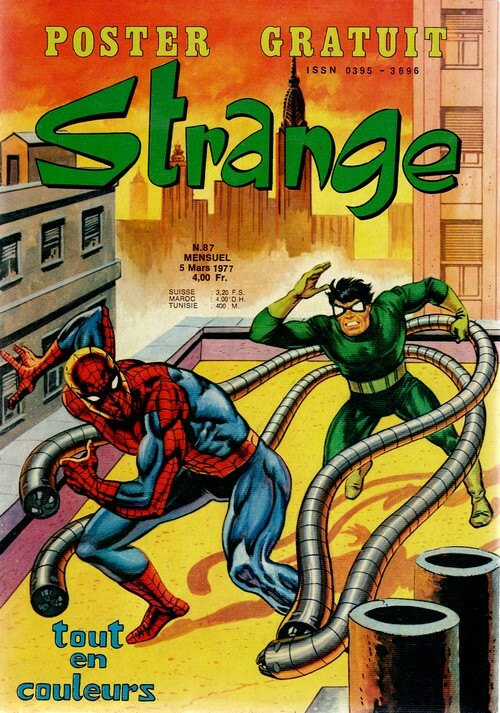 Editions Lug. Strange n° 87 du 5 mars 1977. In-4 broché de 88 pages au format 24 x 17 cm. Belle couverture illustrée. Dos carré. Plats et intérieur frais. Manque le poster. Contient les séries : Captain Marvel, Daredevil, Iron Man, l'Araignée ( Spider-Man ). Scénarios de Stan Lee, Steve Englehart, Gerry Conway et Roger Slifer avec dessins en couleurs par Al Milgrom, Gene Colan, Herb Trimp et Gil Kane. Rare édition originale, en superbe état général de fraicheur.