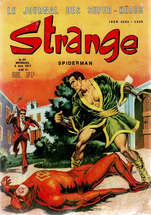 Editions Lug. Strange n° 90 du 5 juin 1977. In-4 broché de 88 pages au format 24 x 17 cm. Belle couverture illustrée. Dos carré. Plats et intérieur frais malgré d'infimes frottis aux coins et une minuscule trace de pliure au coin inférieur du 1er plat. Contient les séries : Les Eternels, Daredevil, Iron Man, l'Araignée ( Spider-Man ). Scénarios de Stan Lee, Jack Kirby, Archie Goodwin, Gerry Conway, avec dessins en couleurs par Jack Kirby, Gene Colan, George Tuska et Gil Kane. Rare édition originale, en très bel bel état général de fraicheur.