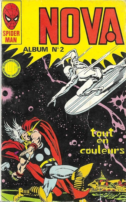 Les Editions Lug / Collection Super Héros / Reliure éditeur, Album Nova n° 2 de 1978. In-12 broché de 256 pages au format 21 x 13 cm. Belle couverture illustrée par Jean-Yves Mitton. Plats et intérieur frais, malgré d'infimes frottis aux coins et de minuscules brunissures au 4ème plat. Dos bien carré. Contient 4 numéros de Nova : 5,6,7,8, avec les séries : Le Surfer d'Argent, Nova et L'Homme Araignée ( Spider-Man ). Rare et fragile édition originale surtout dans un tel état général de fraicheur.