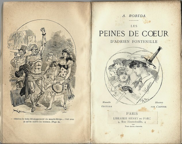 Editions Librairie Henry sans date. In-12 broché de 344 pages au format 18,5 x 12 cm. Couvertures illustrées. Dos carré, insolé et fendu. Plats brunis avec infimes manques et frottis aux coins. Intérieur resté frais. Roman avec frontispice et superbes illustrations en noir de Albert Robida. Deuxième édition après l'originale, parue chez Dentu en 1885. Etat général tous juste correct. Edition peu courante, qui mérite une reliure.