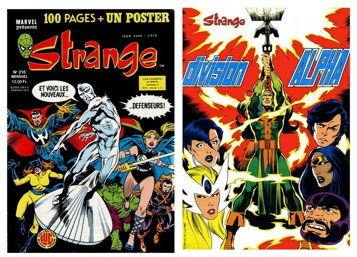 Editions Lug. Strange n° 210 du 5 juin 1987. In-4 broché de 108 pages au format 25 x 17,5 cm. Belle couverture illustrée. Contient les séries : La Division Alpha - L'Homme Araignée - Les Défenseurs - Daredevil. Superbe état général. Edition originale bien complète du rarissime poster de la Division Alpha bien encarté à la revue. Il est au format 32,5 x 46 cm. Le scan du poster est juste indicatif, celui étant solidaire, je n'ai pas pris le risque de le déplier. Le dépliant publicitaire pour Dylan Dog et Martin Mystère est aussi présent.