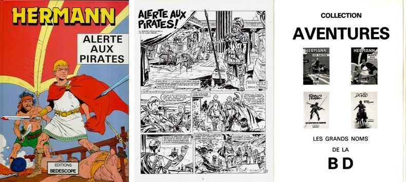 Editions Bedescope / Collection Aventures n° 1 de 1980. In-4 cartonnage éditeur de 30 pages au format 30 x 21 cm. Couverture illustrée. Dos carré. Plats et intérieur. Couverture et dessins en noir par Hermann sur scénarios de Yves Duval et Pierre Step. Contient de courts récits parus dans le Journal de Tintin : Alerte aux Pirates ! - Sauvé par une coquille - Opération " Chair à requins " - 6.000 mètres en chute libre - Le samaritain des montagnes - Georges Madon, le " Mordu ". Rare édition originale en superbe état général.