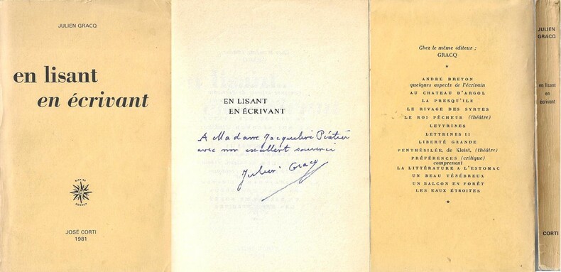 Editions José Corti 1981. In-12 broché de 182 pages au format 18,5 x 12 cm. Couverture avec titre imprimée. Dos carré. Plats frais, malgré de petits frottis aux coins et des bords un peu insolés. Intérieur frais malgré un papier jaunissant. Bel général. Edition originale achevée d'imprimer en décembre 1980 et portant la mention 1981 en couverture et page de titre. Precieux exemplaire enrichi d'une cordiale dédicace autographe, signée, de Julien Gracq.