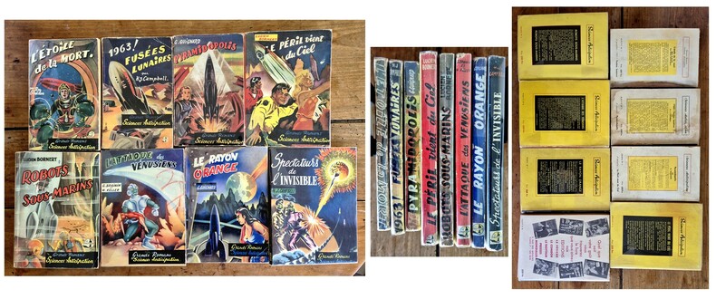 Editions Le Trotteur / Collection " Grands Romans Science Anticipation " 1953. 8 volumes in-12 brochés pour les 3 premiers, puis in-8 brochés pour les autres. Environ 190 pages chacun au format 18 x 11,5 puis 18,5 x 13,5 cm. Superbes couvertures illustrées non signées à l'exception du tome 1 et 7 ( Gordon C. Davies et G.Presle ). Dos carré dont quelques uns pâlis. Plats et intérieur frais, malgré, parfois, de petits frottis aux coins et aux mors. Editions originales, en bel état de fraicheur. Le tome 2 est celui en moins bon état. Rare en série complète.Grands Romans Sciences Anticipation, fut une éphèmere collection parue en 1953. Les auteurs sont Roy Sheldon ( pseudonyme de Herbert J. Campbell ), Herbert J. Campbell, Grégoire Brainin et Henri Keller. Titres Parus : 1 - L'Étoile de la mort (1952, Star of Death)2 - Fusées lunaires (1951, The Moon Is Heaven)3 - Pyramidopolis (1953)4 - Le Péril vient du ciel (1953)5 - Les Robots sous-marins (1940)6 - L'Attaque des Vénusiens (1953)7 - Le Rayon Orange (1954)8 - Spectateurs de l'invisible (1952, Beyond the Visible)